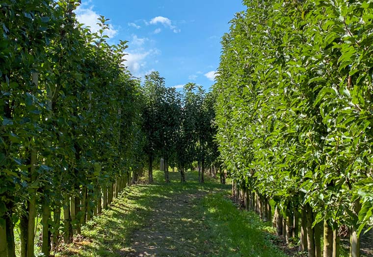 Søjleformet træer kan plantes side om side (0,5 til 1 m afstand mellem træerne, 2 til 3 m afstand mellem rækkerne).
